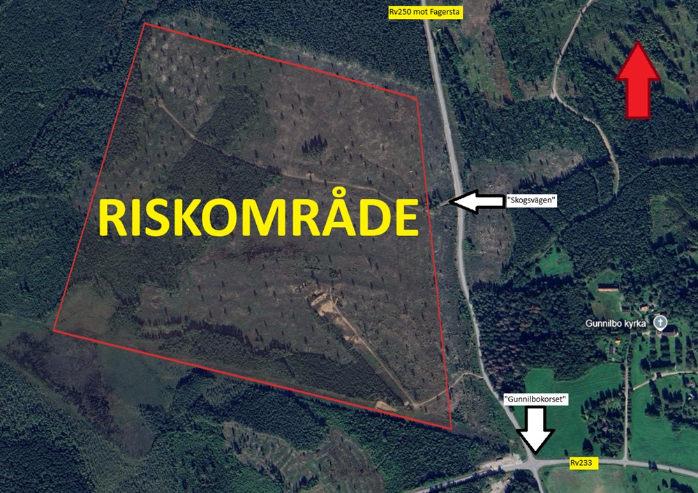 På bilden ovan ser du vårt ordinarie riskområde. Riskområdet är markerat med gul/röda skyltar med texten: [Riskområde för skjutbana].